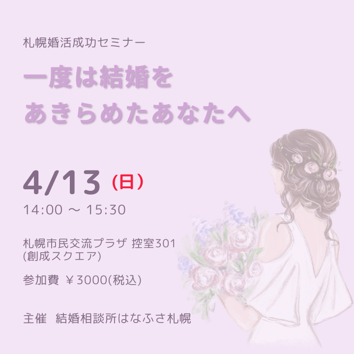 ホーム: ホーム: » 札幌婚活成功セミナー » 【4/13開催】一度は結婚をあきらめたあなたへ » 2025セミナーアイキャッチ (1280 x 720 px) (Instagramの投稿) (13) 2025セミナーアイキャッチ (1280 x 720 px) (Instagramの投稿) (13)By kekkon-hanafusa / 2025年3月19日